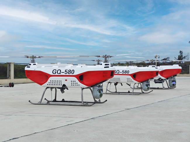 任务执行当日,三架GQ-580无人直升机根据既定方案,分时段、分高度层精准飞抵预定待命空域,构建了高空俯瞰、中空机动、低空详查的立体化监视网络。凭借其出色的悬停稳定性、强大的抗风能力以及多机协同控制能力,机队在空中形成了稳定可靠的“空中观测基站”。